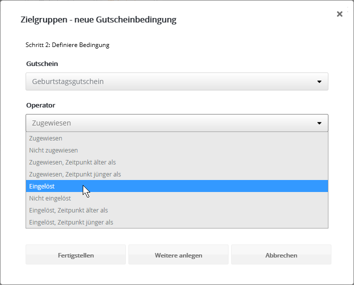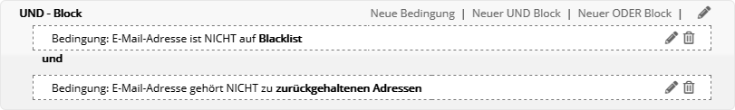 Insbesondere nach dem Kopieren einer vorhandenen Zielgruppe kann das sinnvoll sein, wenn die identischen Abonnenten in Original und Kopie nicht gewünscht sind. Bedingung anhand GutscheinFiltern Sie Abonnenten danach, ob und in welchem Zeitraum die Zuweisung oder Einlösung eines Gutscheins stattfand. Tipp: Um zugewiesene Gutscheine als eingelöst zu markieren, nutzen Sie entweder die Webservice-Funktion 'RedeemVoucherByCode' oder importieren in der Gutscheinübersicht eine CSV-Datei mit den eingelösten Gutscheincodes. Bedingung anhand SelektionMit diesem Bedingungstyp nutzen Sie eine per Webservice angelegte Selektion von Abonnenten als Emma-Zielgruppe. Der Bedingungstyp ist nur dann sichtbar, wenn per Webservice mindestens eine Selektion angelegt wurde. Das Besondere: In einer Selektion werden Abonnenten anhand einer Liste von IDs gruppiert. So lässt sich eine extern getroffene Abonnentenauswahl als Zielgruppe nutzen, ohne dass in den Emma-Abonnentendaten ein gemeinsames Merkmal vorliegen muss. Die Details entnehmen Sie bitte der Webservice-Dokumentation, die wir Ihnen gern zusenden. Bedingung anhand des Empfängers (geplant)Diese Bedingung entscheidet, ob ein Abonnent als Empfänger eines bestimmten Mailings vorgesehen war oder nicht. Das bedeutet, dass er in einer Abonnentenliste bzw. Zielgruppe für ein bestimmtes Mailing steht, welches versandt wurde. Im Unterschied zur letztgenannten Bedingung wird der tatsächliche Empfang jedoch nicht geprüft. Es sind auch alle Empfänger enthalten, die das Mailing z. B. aufgrund von Bounces, Blacklists oder serversseitigen Spamfiltern nicht empfangen haben. Bedingung anhand des Empfangens (zugestellt)Diese Bedingung entscheidet, ob jemand ein bestimmtes Mailing empfangen hat oder nicht. Das Mailing gilt als empfangen, wenn der E-Mail-Server des Abonnenten eine positive Rückmeldung erteilt hat. Im Schritt nach dem Empfang ist es dennoch möglich, dass das Mailing beim Empfänger in einem Spamordner landet. Bedingung anhand des BounceverhaltensDamit legen Sie Bedingungen anhand der Zustellungen oder Nichtzustellungen eines bestimmten Mailings an. Bedingung anhand Blacklist bzw. Zurückgehaltener AdressenAbonnenten, deren E-Mail-Adresse auf einer Blacklist oder der Liste der zurückgehaltenen Adressen steht, werden automatisch vom Versand ausgeschlossen. Dieselben* Abonnenten lassen sich per Zielgruppe filtern, etwa um sie beim Export Ihrer Abonnentendaten ebenfalls auszuschließen. Die kombinierte Zielgruppe sieht wie folgt aus: