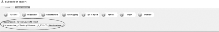 Save the file as a file with the feature 'CSV (Comma delimited)'. Apple user: If you own an apple computer, you will have to safe the file as 'CSV-Windows'. Emma does not run files in the Mac format. Step 1 – Import fileOn the navigation bar click on 'Subscribers' and then go to the navigation subitem 'Import'. This is the way how you get to the menu-guided import function of Emma. First, you will have to choose the file which you want to import; |