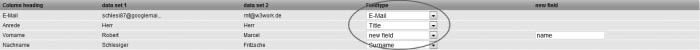 if the first line of your address file contains (as shown in the example above) the column headings, leave the item 'First line contains column headings' marked . Otherwise, if your address file starts right away with the subscriber data, unmark this option. Step 3 – Subscriber ListsChoose the subscriber list to which you want to import the addresses. Subsequently click on 'Next'. Step 4 – Field MappingNow you are asked to match the field names of your subscriber data with those of Emma. In order to do so, please choose in the drop down menus the associations which correspond to field information displayed to the left of these menus. If there does not exist a matching subscriber field, choose 'New Field' and enter a name for the subscriber field that needs to be created. Click 'Next'.