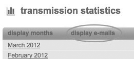 In the transmission- statistic you see the data collected from Emma (Traffic, Total). Also you see, if exist, the numbers of test-sendings, clicks on the subsriber-link and the number of subscribers who have completed the optin-confirmation. Next to the view 'display months' you also can select 'display e-mails'. So Emma outputs the above mentioned figures for each mailing.