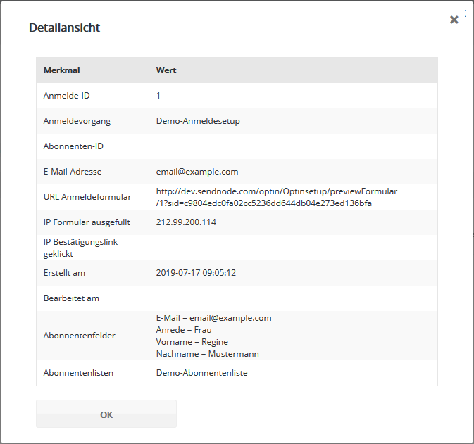 Angezeigt werden die E-Mail Adresse und der verwendete Anmeldevorgang  sowie die Zeitpunkte, zu denen der Anmelde-Klick und die Bestätigung per Double-Opt-In stattfandt.